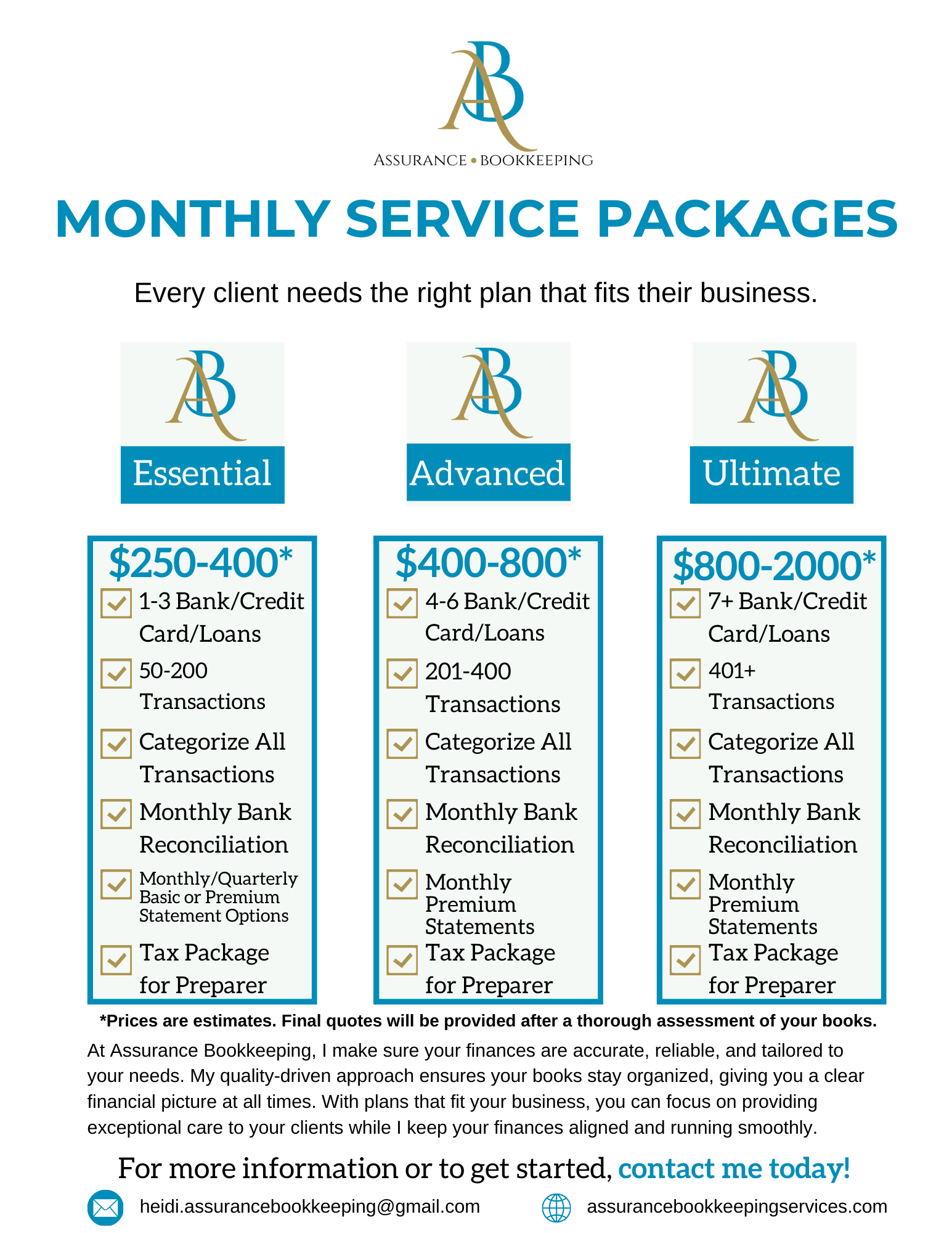 I don’t believe in a “cookie cutter” approach to bookkeeping. Because each business is different, packages and pricing will vary depending on volume and business activity so I can meet your exact needs.